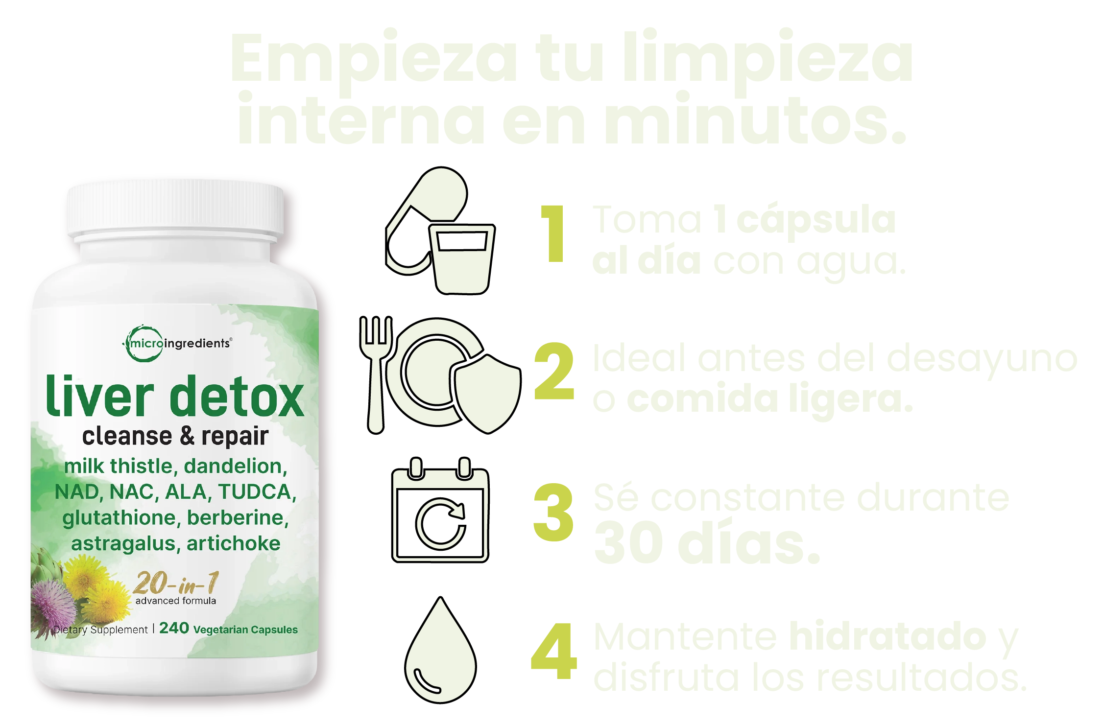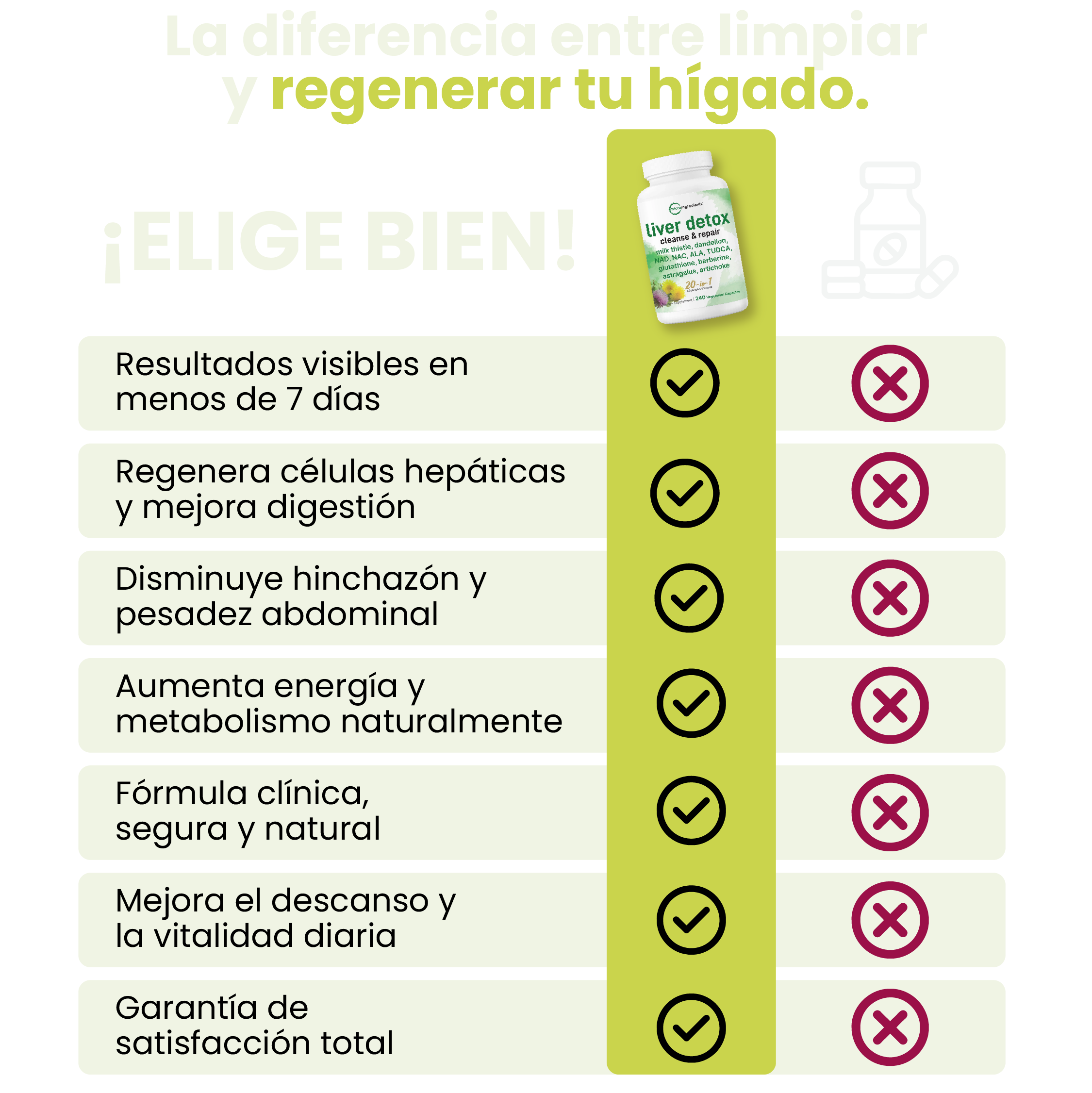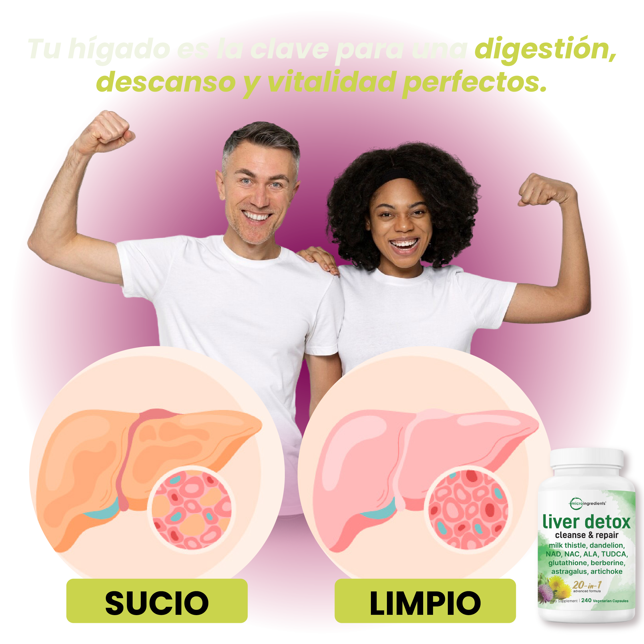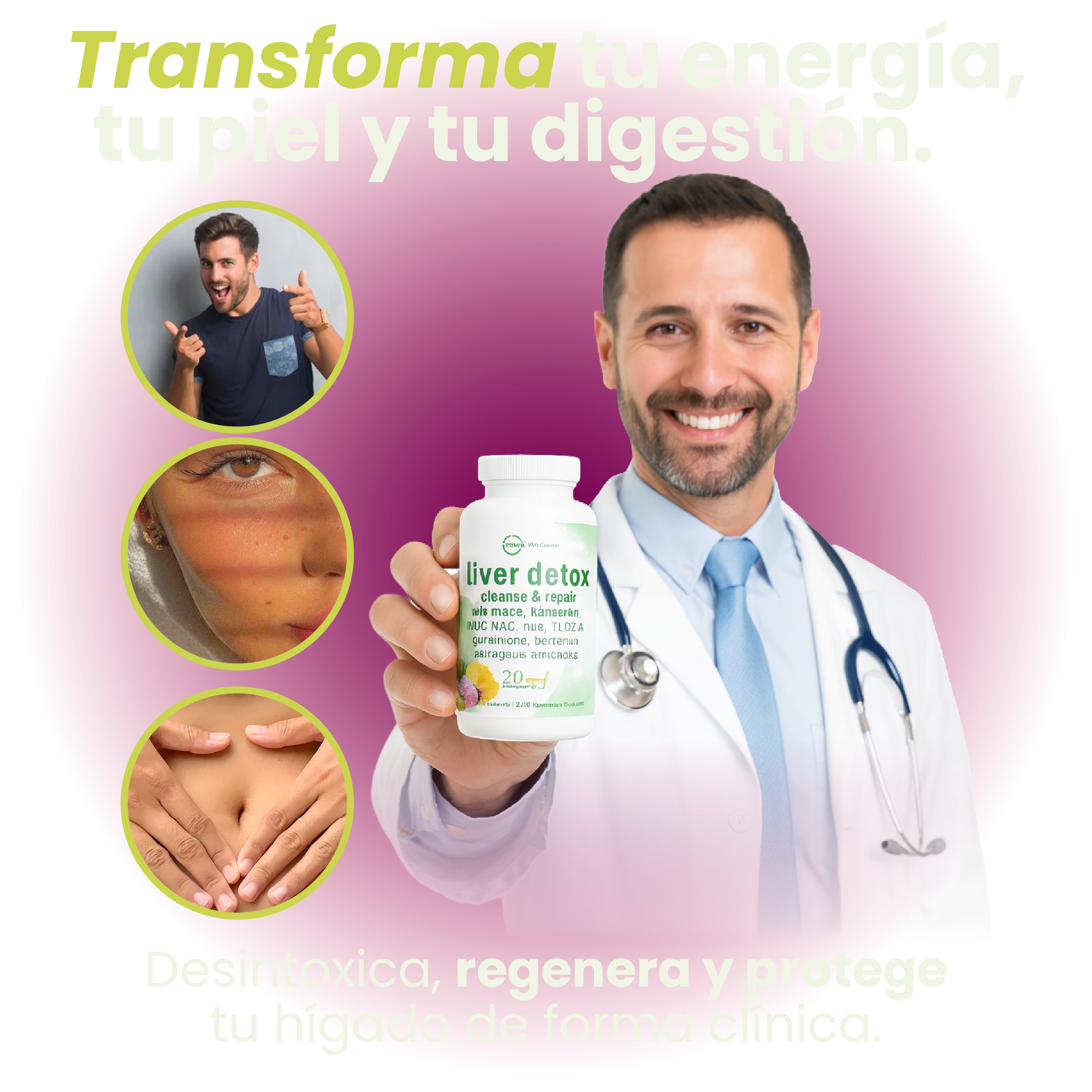 El exceso de toxinas, alcohol, medicamentos y comidas procesadas ralentiza tu metabolismo, causa fatiga y acumulación abdominal. Un hígado intoxicado dificulta la digestión y el descanso, afectando tu piel y energía.